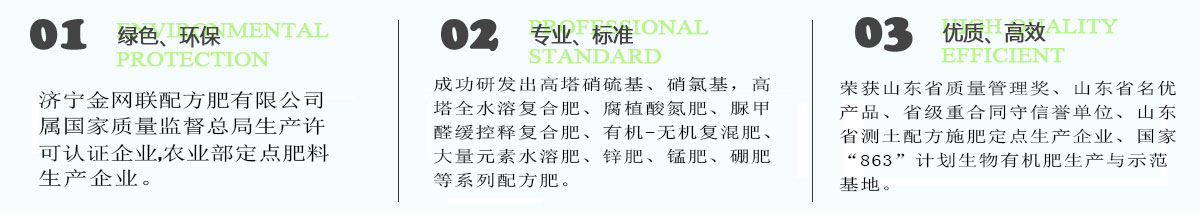 濟寧金網聯配方肥有限公司屬國家質量監督總局生產許可認證企業,農業部定點肥料生產企業。公司技術力量雄厚,生產工藝先進,原料上乘,與著名高等院校、農科院所和知名企業精誠合作,成功研發出高塔硝硫基、硝氯基,高塔全水溶復合肥、腐植酸氮肥、脲甲醛緩控釋復合肥、有機-無機復混肥、大量元素水溶肥、鋅肥、錳肥、硼肥等系列配方肥。